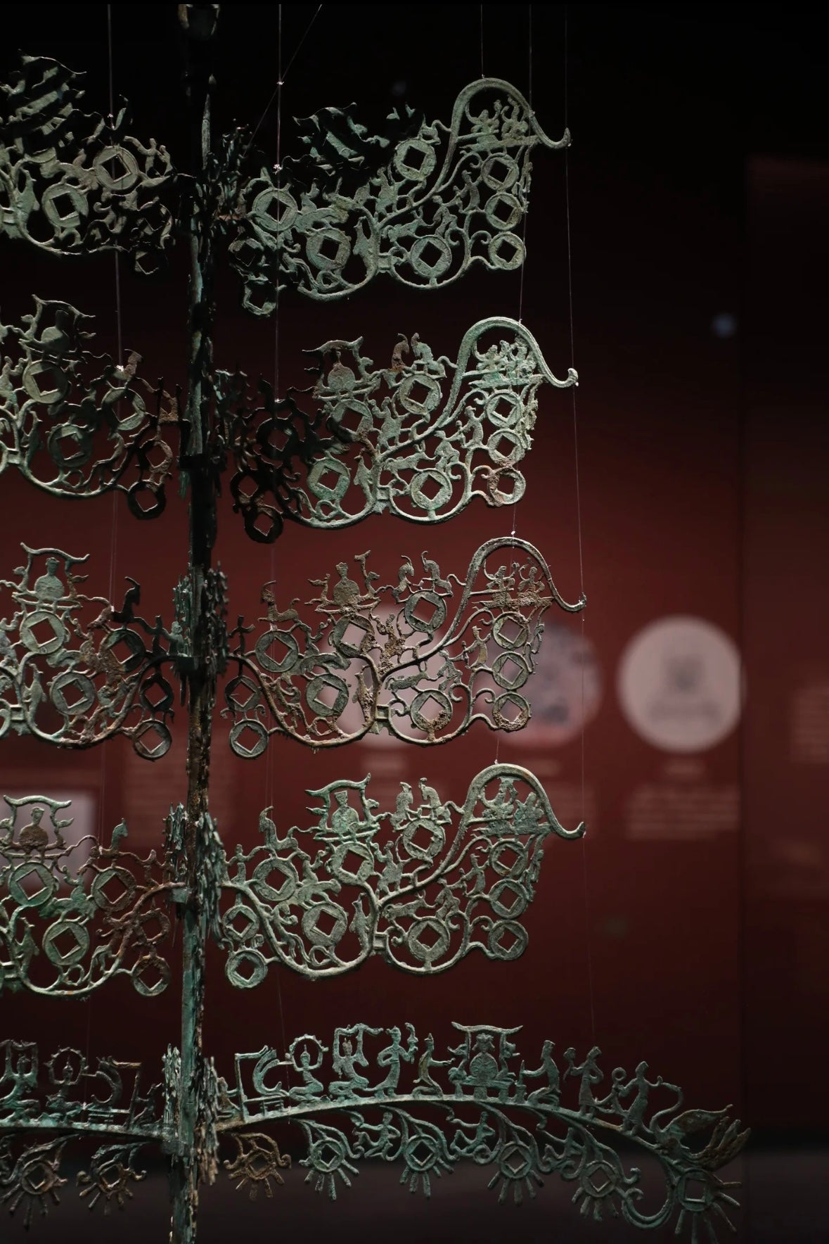 This bronze and pottery artifact is a unique historical art piece from the Bashu region, renowned as a symbol of infinite, growing wealth and enduring legacy. Its original full height is approximately 53 inches(135cm). It represents the pinnacle of art unique to the region, merging ancient tree worship with Daoist immortality beliefs and modern success goals. It is considered a three-dimensional encyclopedia of Han Dynasty culture and belief.